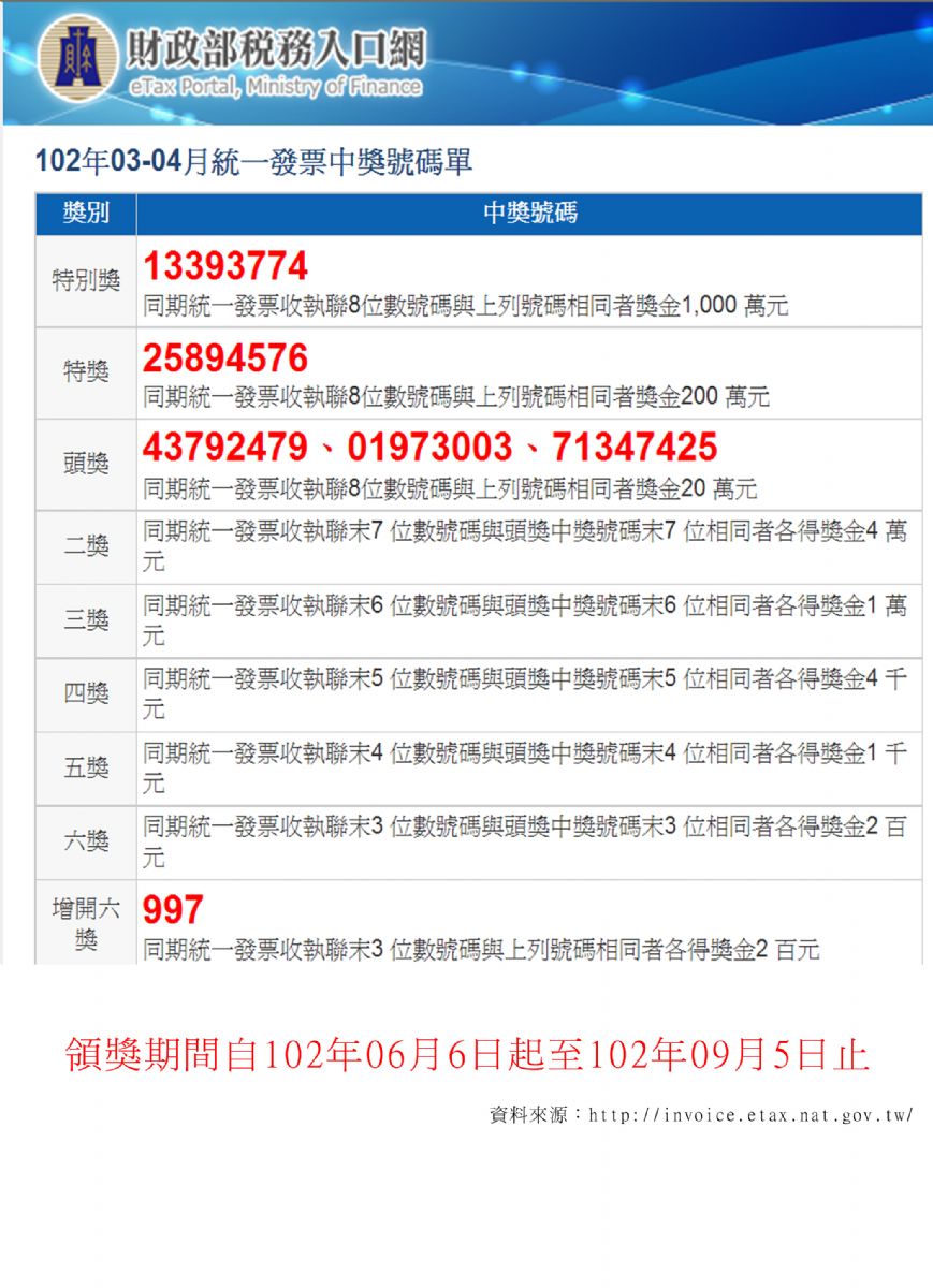 102年03-04月期統一發票特別獎及特獎中獎清冊